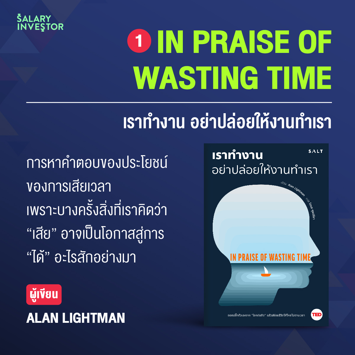 หนังสือที่ว่าด้วยเรื่องประโยชน์ของการเสียเวลา เมื่อปัจจุบันการนั่งนิ่งๆ ไม่ได้ทำอะไร อยู่กับความคิดของตัวเอง ถูกมองว่าเป็นเรื่อง “เสียเวลา” แต่การเสียเวลาที่ว่านั้นมันเลวร้ายขนาดนั้นจริงๆ มั้ย