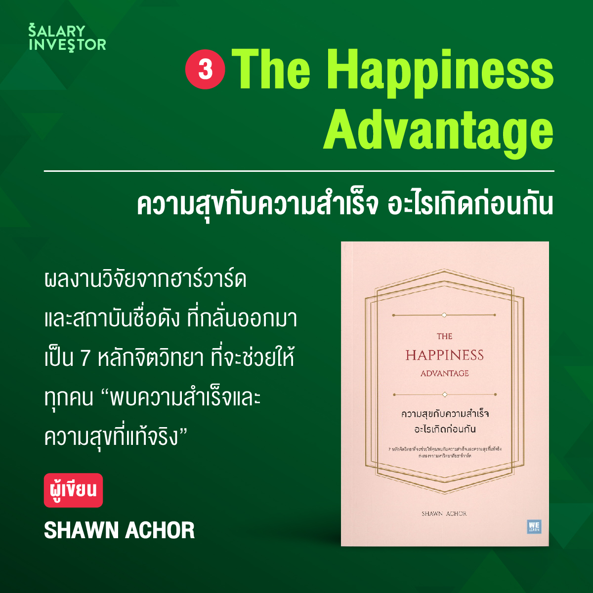 หนังสือแนวจิตวิทยาที่จะพาทุกคนไปสำรวจต้นกำเนิดที่แท้จริงของความสุขและความสำเร็จ ผ่านงานวิจัยจากมหาวิทยาลัยฮาร์วาร์ดและสถาบันอื่นๆ อีกหลายแห่ง กลั่นออกมาเป็น 7 หลักจิตวิทยาที่จะช่วยให้ทุกคนพบความสำเร็จและความสุขที่แท้จริง
