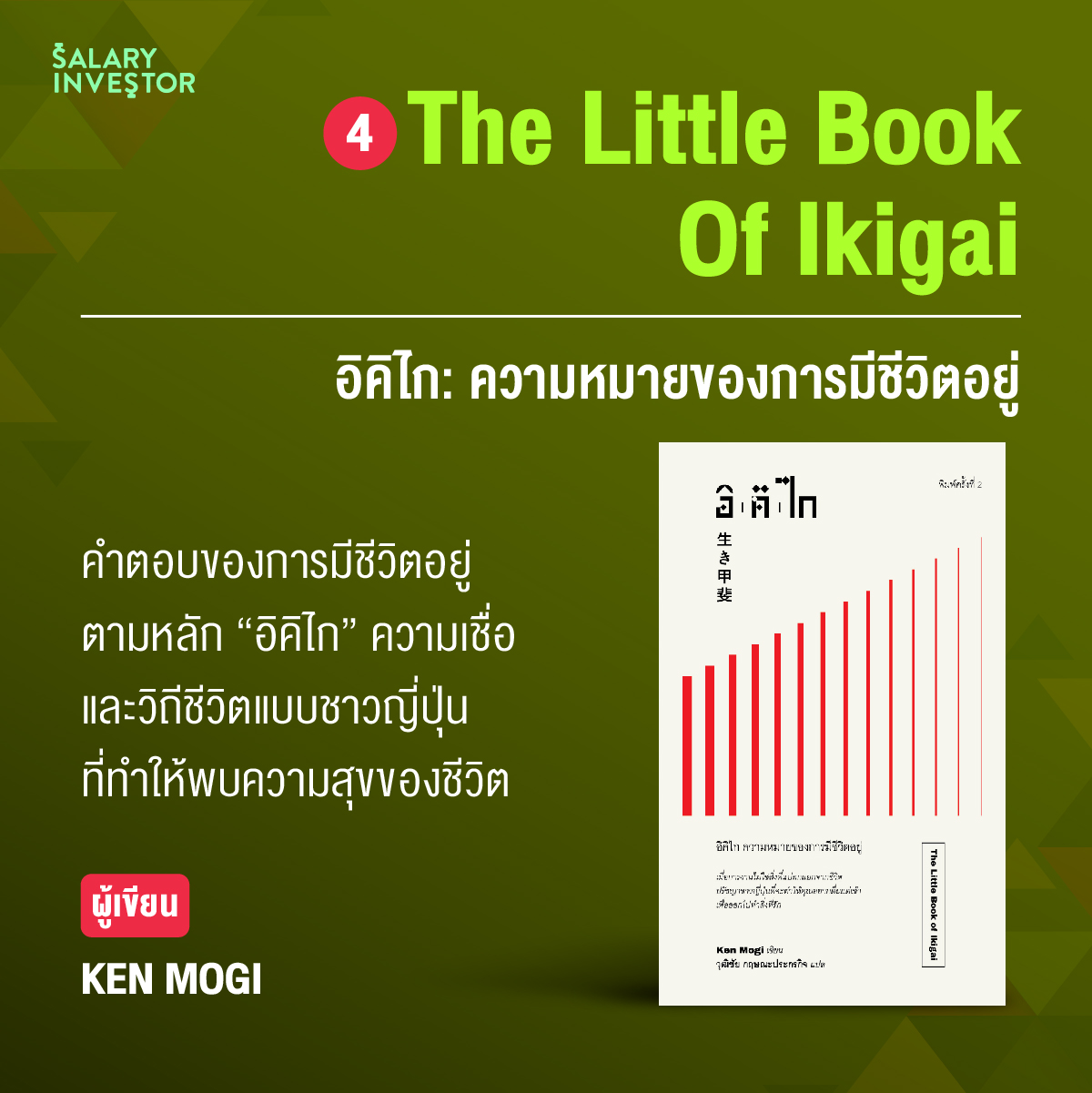 หนังสือที่จะพาทุกคนไปร่วมหาคำตอบของการมีชีวิตอยู่และสิ่งที่เราทำอยู่จนเจอ โดยอ้างอิงจากหลักอิคิไก ความเชื่อหรือวิถีชีวิตแบบชาวญี่ปุ่นที่ทำให้อายุยืนเป็นร้อยๆ ปี