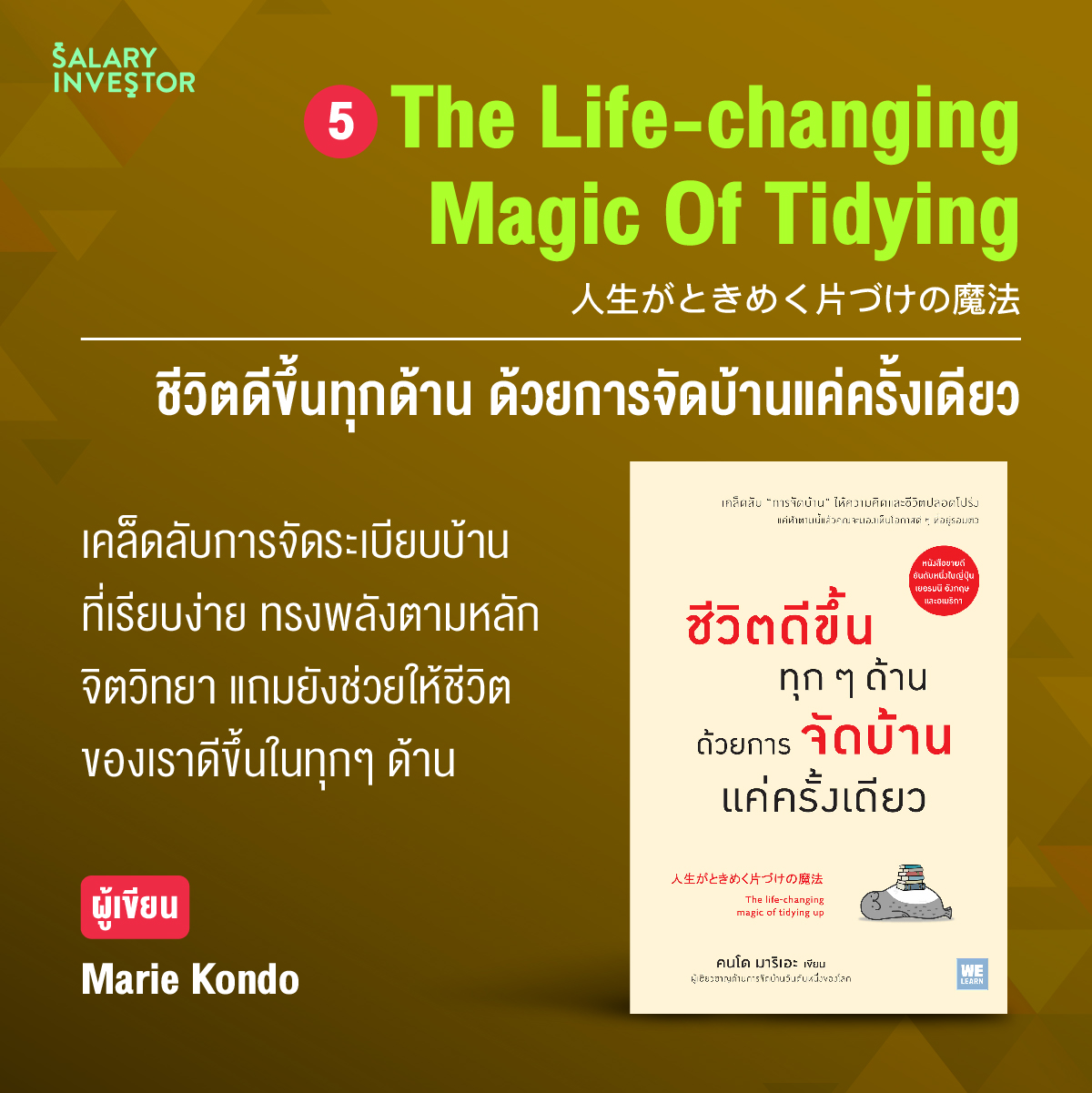 หนังสือเล่มนี้จะมาแนะนำเคล็ดลับการจัดบ้านที่เรียบง่าย ทรงพลัง และมีหลักจิตวิทยารองรับ ซึ่งไม่เพียงช่วยให้บ้านของคุณหายรกแบบถาวรหลังจากลงมือจัดบ้านแค่ครั้งเดียว แต่ยังช่วยให้ชีวิตของคุณดีขึ้นในทุกๆ ด้าน