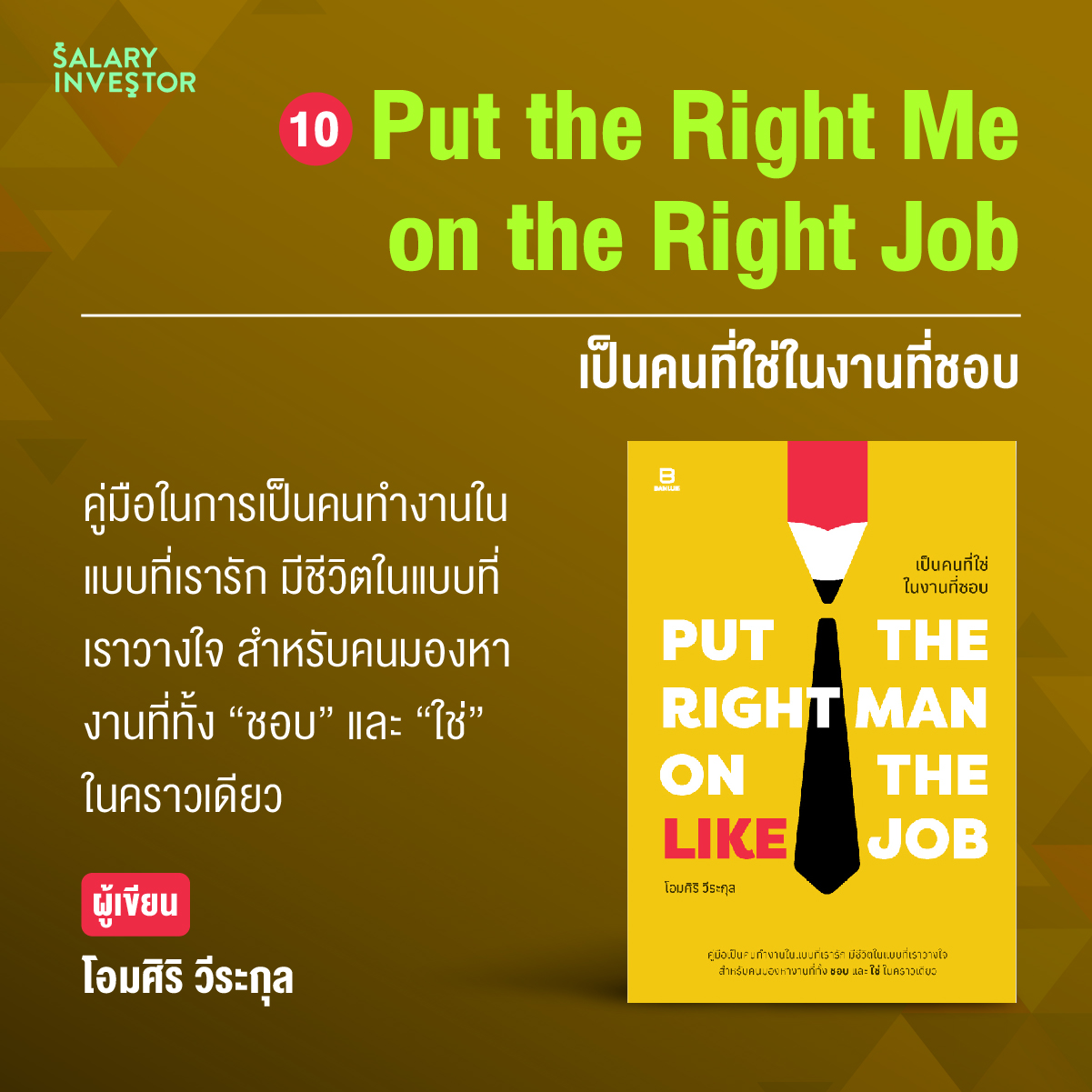 ด้วย 35 ความเรียงกึ่งฮาวทูที่ว่าด้วยการทำงาน การค้นหาตัวตน หางานที่ทั้งชอบ และใช่ในเวลาเดียวกัน หยิบยกเรื่องราวของคนทำงานชื่อดังทั้งไทยและต่างประเทศ มาเล่าเปรียบเทียบให้เห็นในรูปแบบสบายๆ เหมือนเพื่อนคุยกัน เห็นภาพชัด เข้าใจง่าย นำไปใช้ได้เลย
