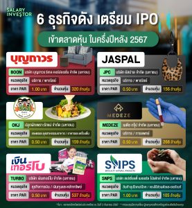 วันนี้ Salary Investor พาทำความรู้จักกับ 6 บริษัทเด่น จะ IPO ปลายปี 2567 ที่ได้รับอนุญาตแบบคำขอให้เสนอขายหลักทรัพย์ที่ออกใหม่แล้ว และ ยื่นแบบต่อ ก.ล.ต. ทั้งหมดอยู่ในตลาดหลักทรัพย์ SET ไปดูกันเลย