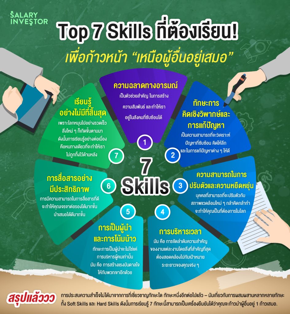 การประสบความสำเร็จไม่ได้มาจากการที่เชี่ยวชาญทักษะใด ทักษะหนึ่งอีกต่อไปแล้ว – มันเกี่ยวกับการผสมผสานหลากหลายทักษะ ทั้ง Soft Skills และ Hard Skills ดังนั้นการเรียนรู้ 7 ทักษะนี้สามารถเป็นเครื่องยืนยันได้ว่าคุณจะก้าวนำผู้อื่นอยู่ 1 ก้าวเสมอ.