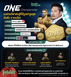 ONE หรือ One Championship รายการแข่งขันศิลปะการต่อสู้ชื่อดัง ติดอันดับ 4 องค์กรกีฬาการต่อสู้ที่มีมูลค่าทางธุรกิจสูงสุดในโลกประจำปี 2567 โดยนิตยสาร “ฟอร์บส์”
